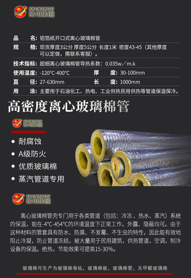 神州公司生產(chǎn)的玻璃棉施加粘結(jié)劑加溫固化成型的圓柱體保溫管材,廣泛應(yīng)用于電力、石油、化工等熱力管道及冷、熱水管和蒸氣管的絕熱保溫。它施工方便,節(jié)能顯著,表面粘貼鋁箔等貼面,既可保溫、防潮、防輻射,還有一定裝飾性。